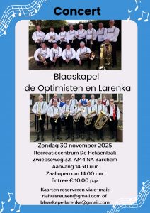 Larenka zal samen met de Optimisten uit Bredebroek een leuke muzikale middag verzorgen. Dit is op zondag 30 november bij de Heksenlaak te Zwiep (Barchem).